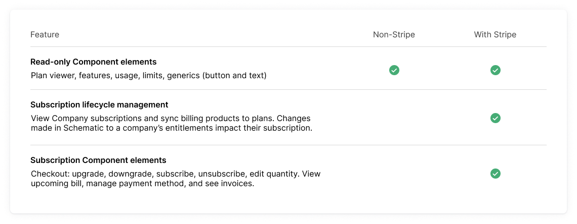 Companies in Schematic may be assigned plans that are not included here, but there will be no option to independently subscribe to them using Schematic Components.