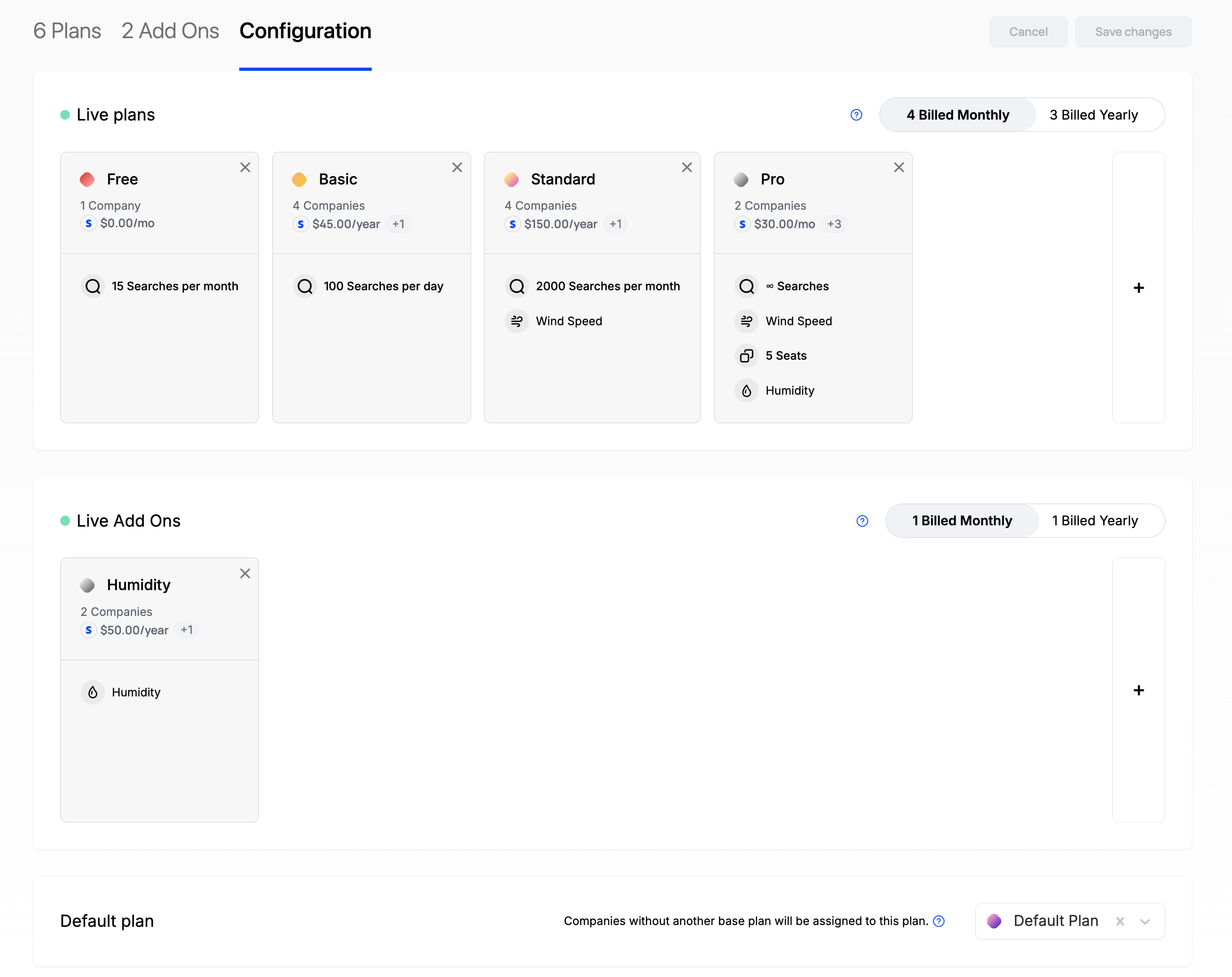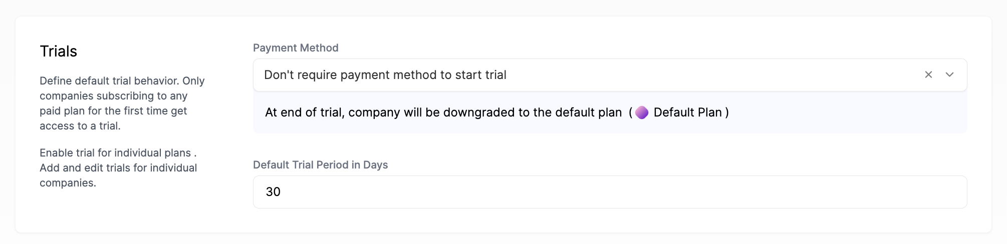 - Choose a default plan that all companies will be assigned if they do not currently have a subscription (optional)