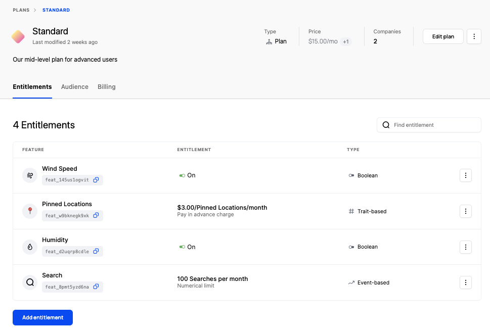Entitlements may be boolean or be metered, and there is no limit to the number entitlements in any given plan.