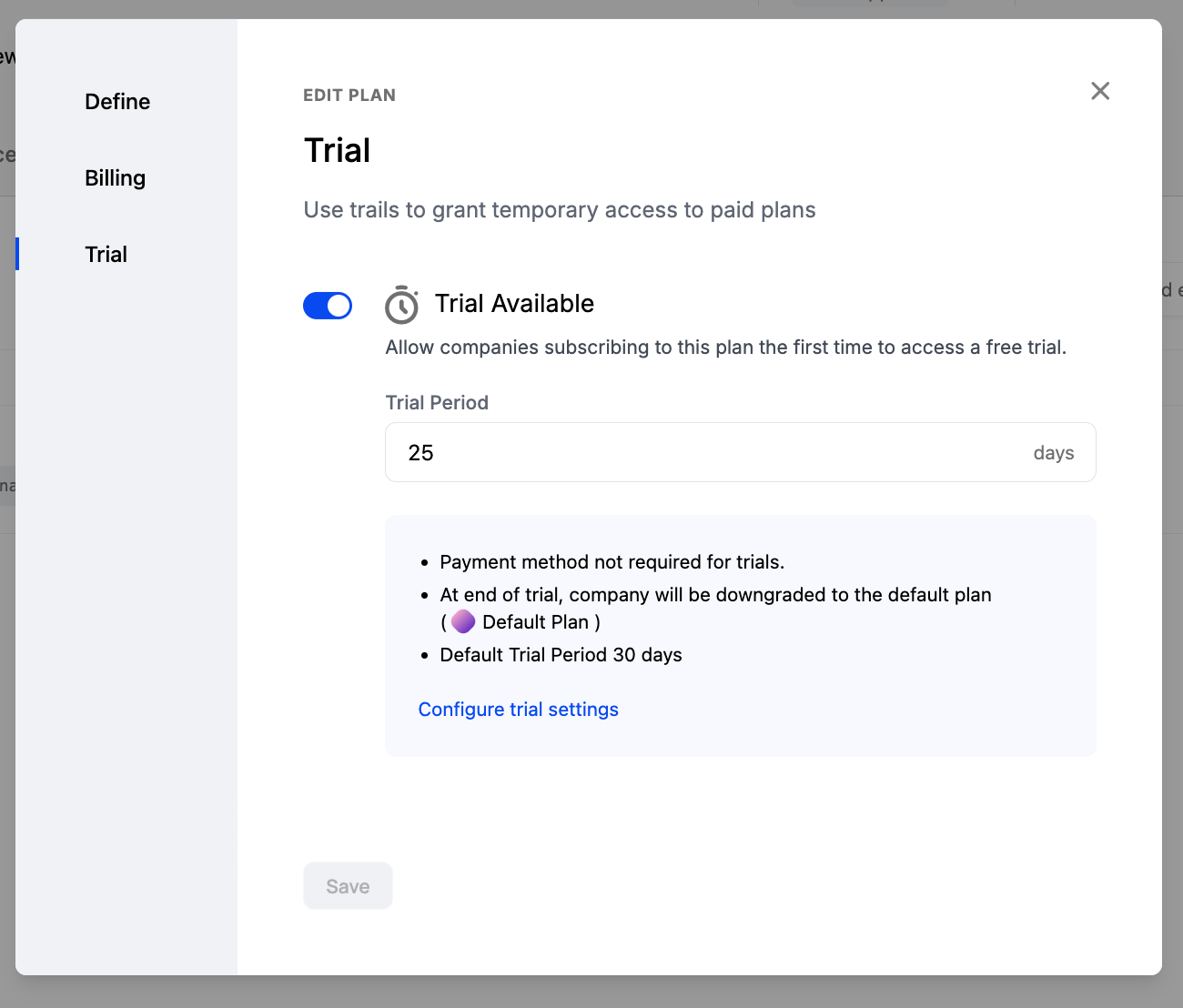 When a trial period is defined for a plan, Schematic will ensure that the company receives the corresponding entitlements for that period the first time they are assigned that plan. You can configure whether payment is required up front or not — if it is required, the company will convert into the corresponding paid plan automatically; if not, they will downgrade to your default plan.