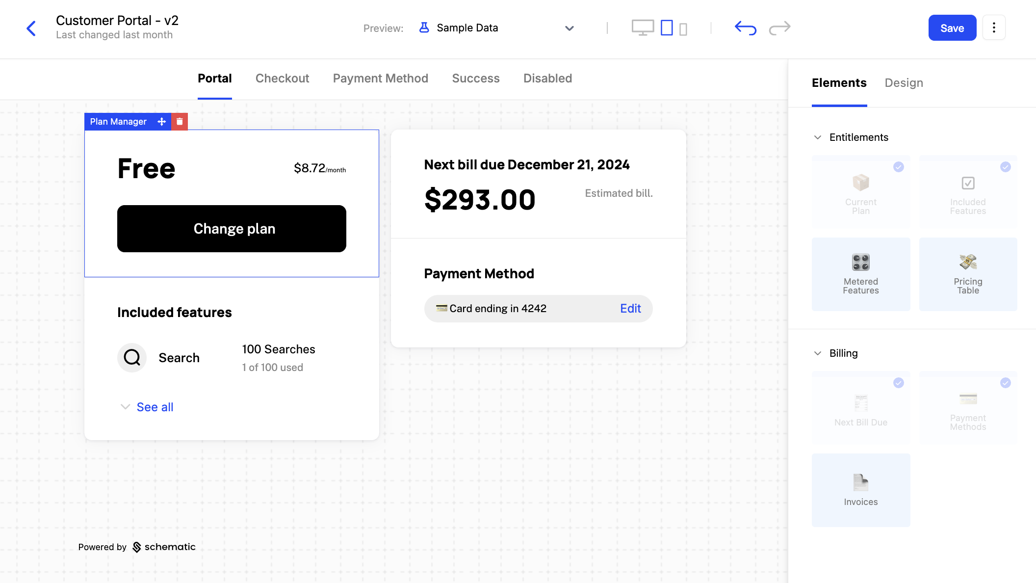 Within Schematic, you have access to a Component Builder which allows for full customization both in the elements that are a part of any given Component (e.g. Current Plan, Included Features, Invoices, etc.) and in how the Component looks and feels (so it appears native to your product).