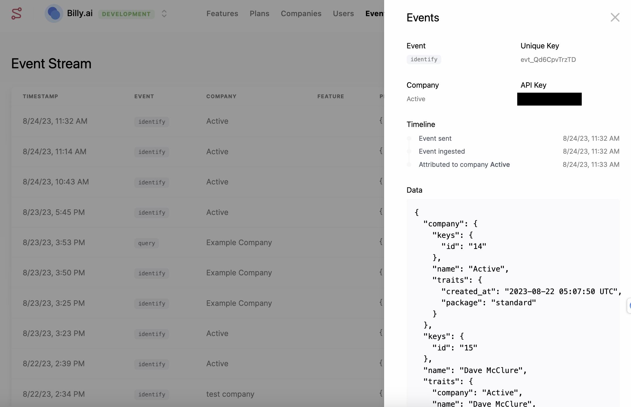 You can use the Events tab to verify identify and track requests are getting to Schematic and that they are being properly associated with users, companies, and features. This is also possible in the company and user profile views.