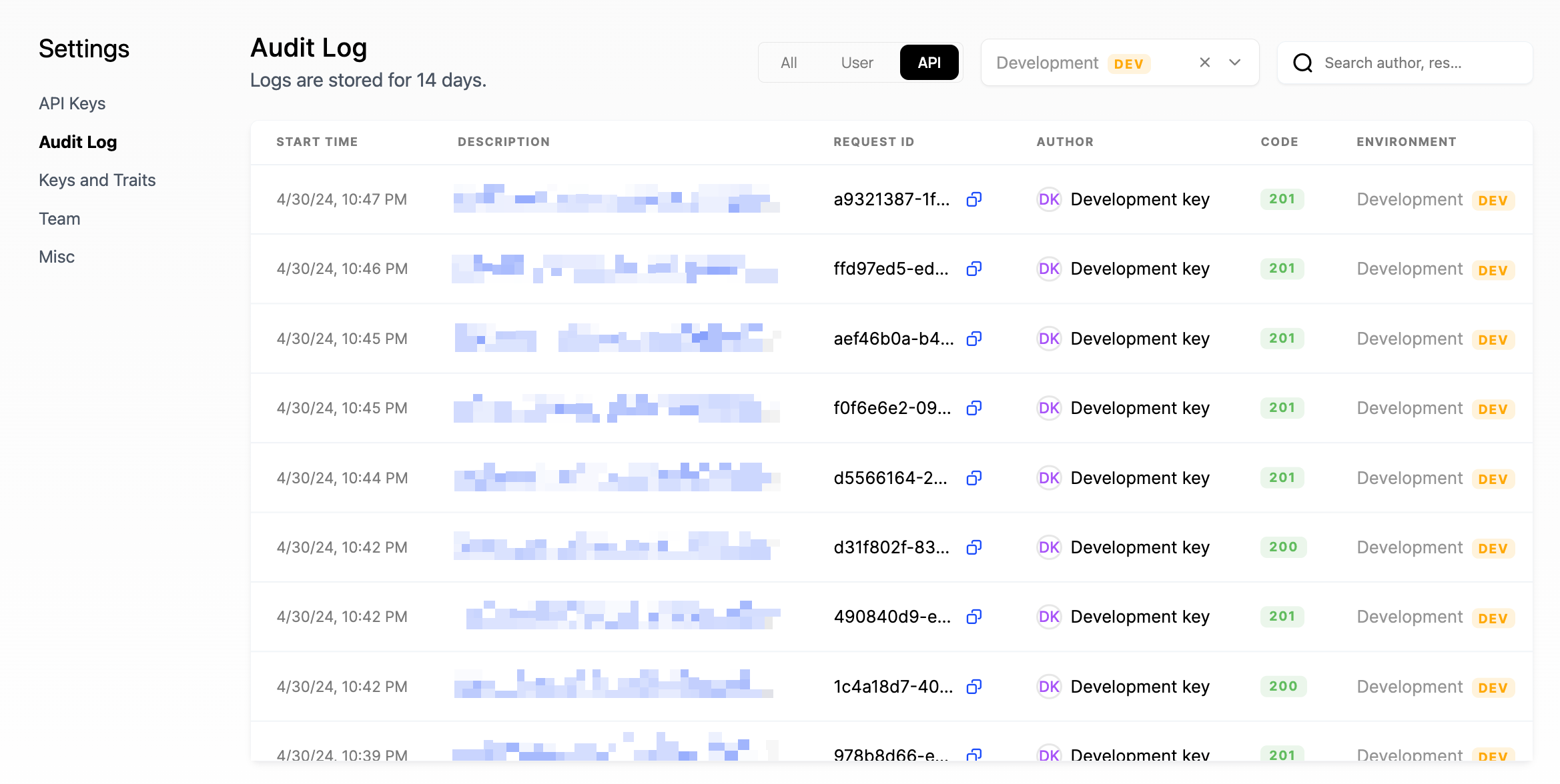 You can view the Audit Log within Settings to see both successful and unsuccessful requests. Within each request, you can view detail describing the response code, request ID, start/end times, the API key used, the method, the URL path, and the request & response payloads.