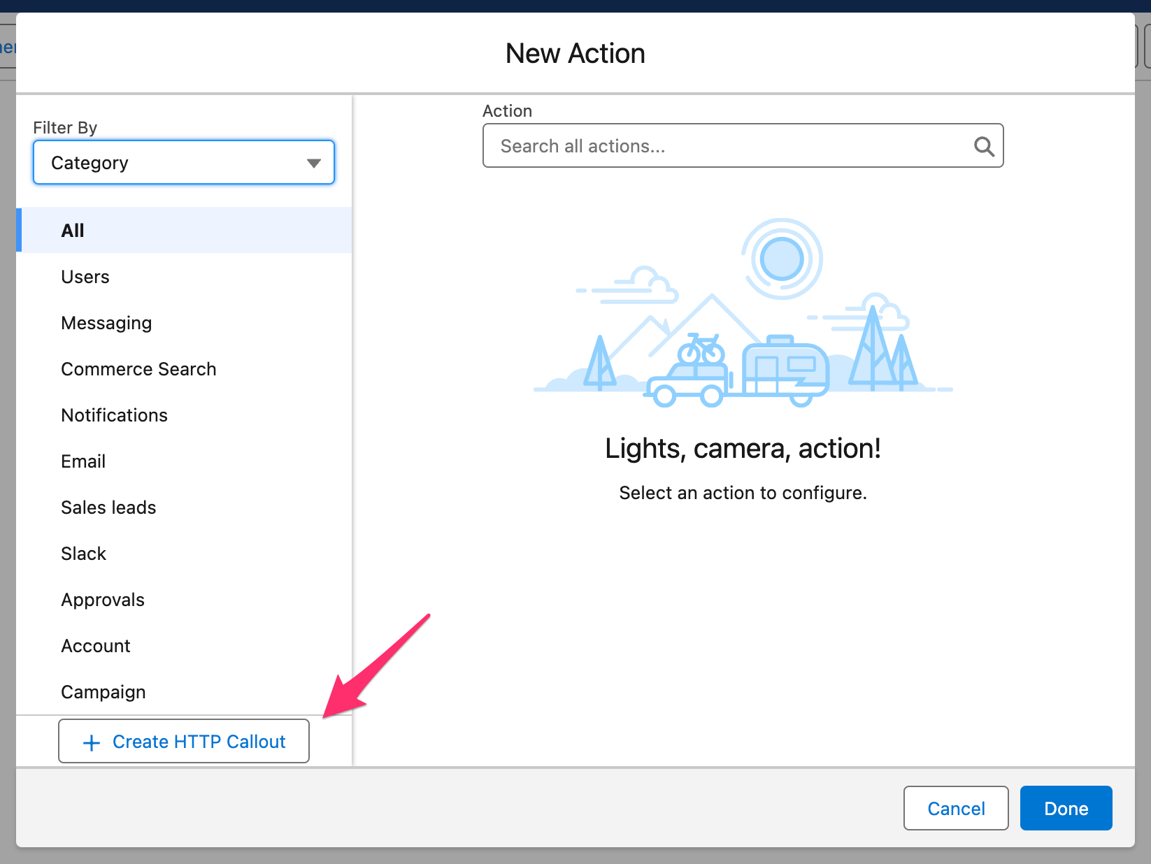 Add an Action Element, then select HTTP Callout. Name the action and select the named credential that was created above.