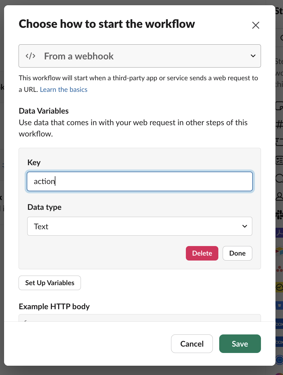 - Start the workflow “From a webhook” and click Continue in the modal (we’ll set up variables later)