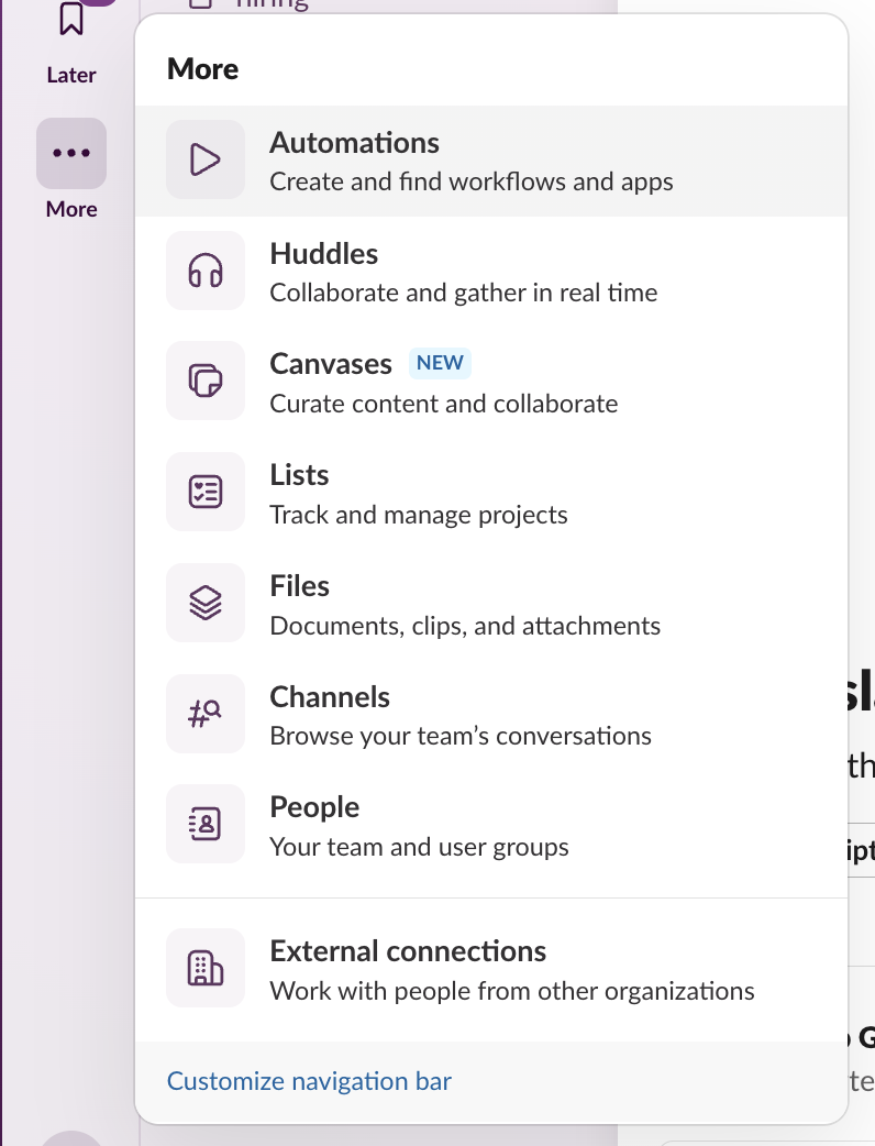 - Navigate to Automations in Slack