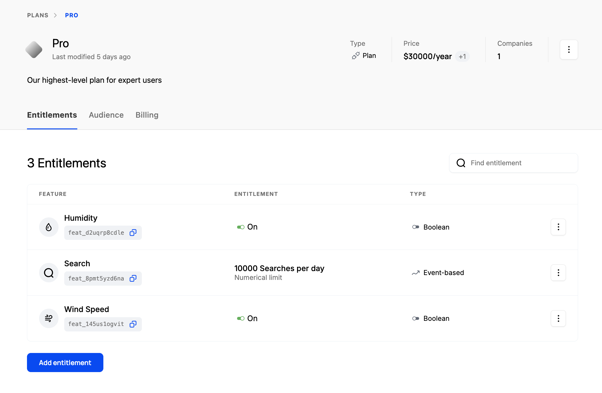 If a Company is a part of a Plan, access can be gated in your application based on associated Entitlements with Flags.