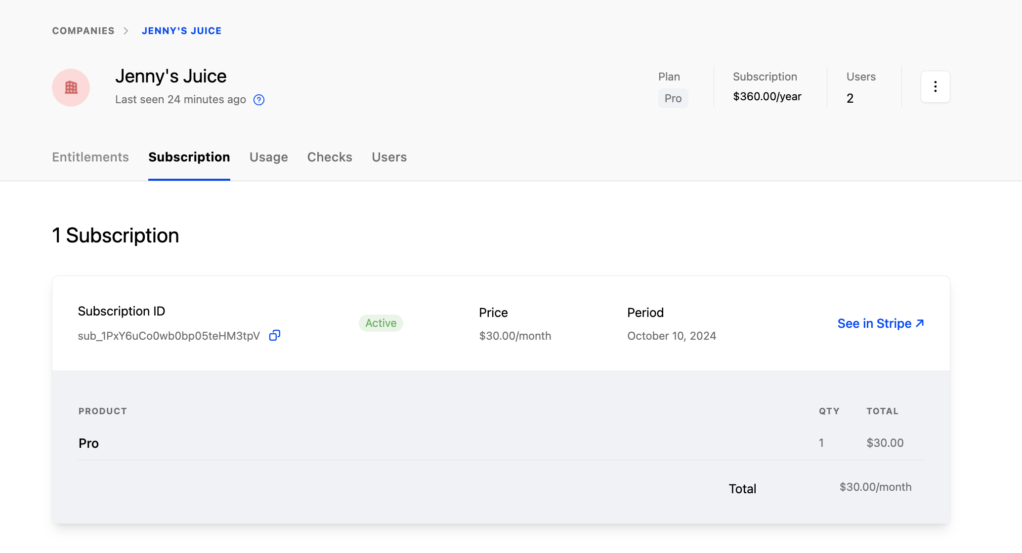 Subscriptions from Stripe are automatically linked to Company Profiles.