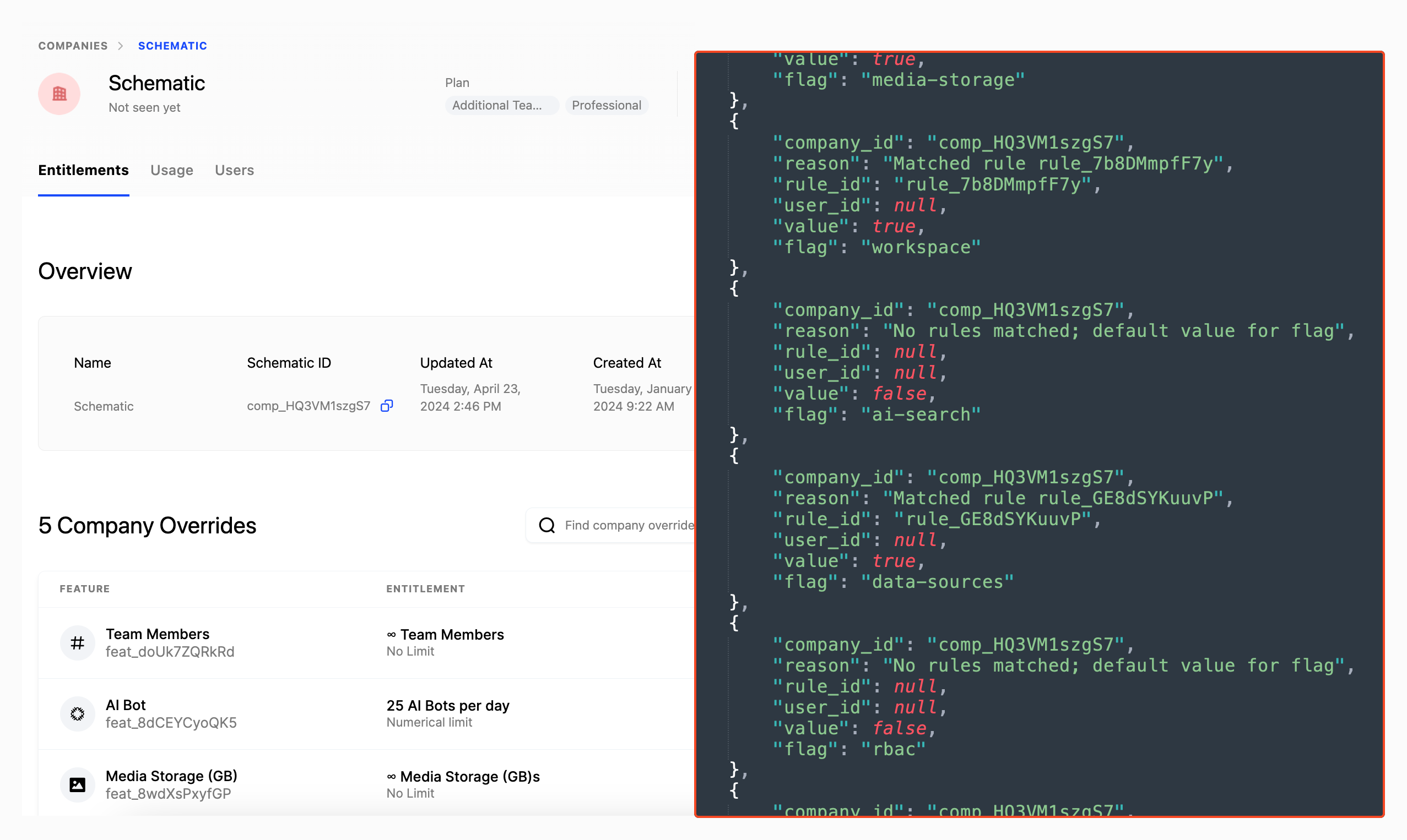 Company access is informed by the parameters of a company’s subscription and other policies set up in Schematic.